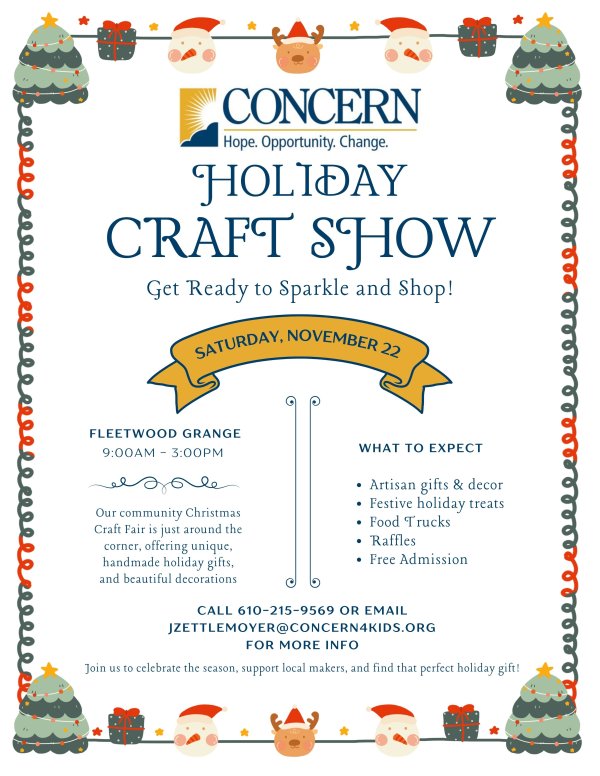 Volunteer at CONCERN's first ever craft show.  Help with set up (5:30 am - 9:30 am), sell raffle tickets, help children with letters to Santa/Holiday cards, work in the kitchen, greet people. help as needed to make this event successful to raise money for kids in foster care. (Shifts are 9-12 and 12-3).